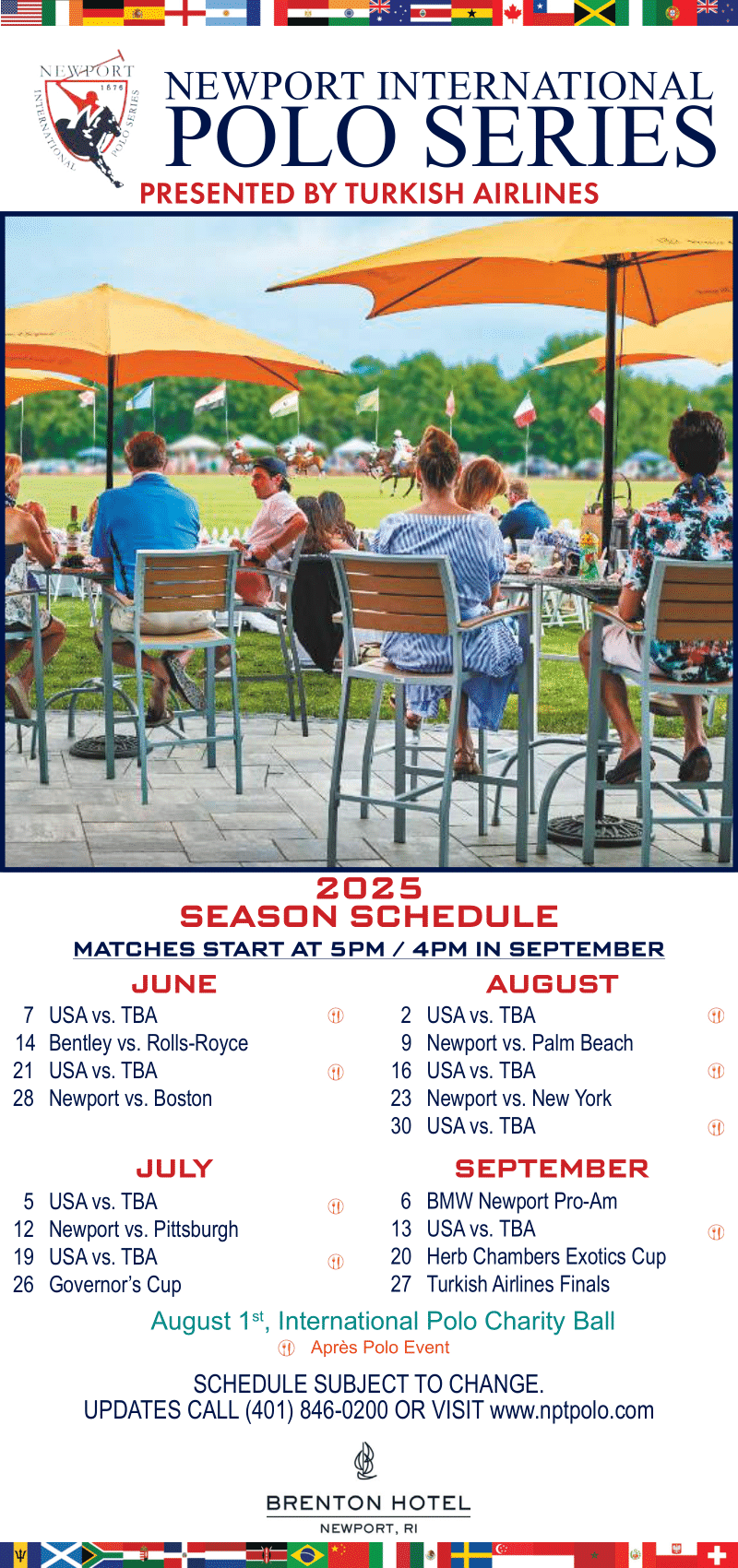 The 2025 Newport International Polo Series kicks off on Saturday, June 7th with an international opponent making its debut appearance for Opening Day festivities. Weekly matches are held every Saturday, June through September, starting at 5 PM (4 PM in September). See below for the full 2025 Newport Polo Season Schedule.